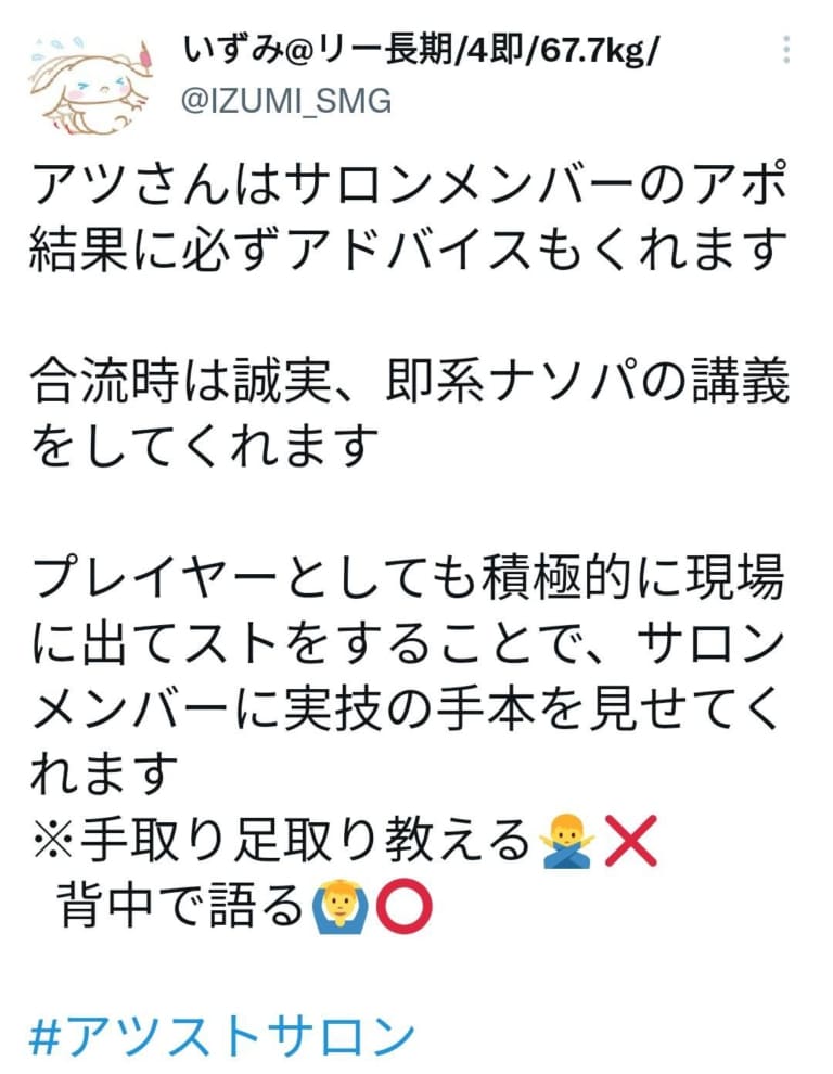 ブサメンながら、基礎を忠実にしつつナンパテクニックで成果を上げている。理論と実践を融合した独自の指導スタイルで実績者を多数輩出。
